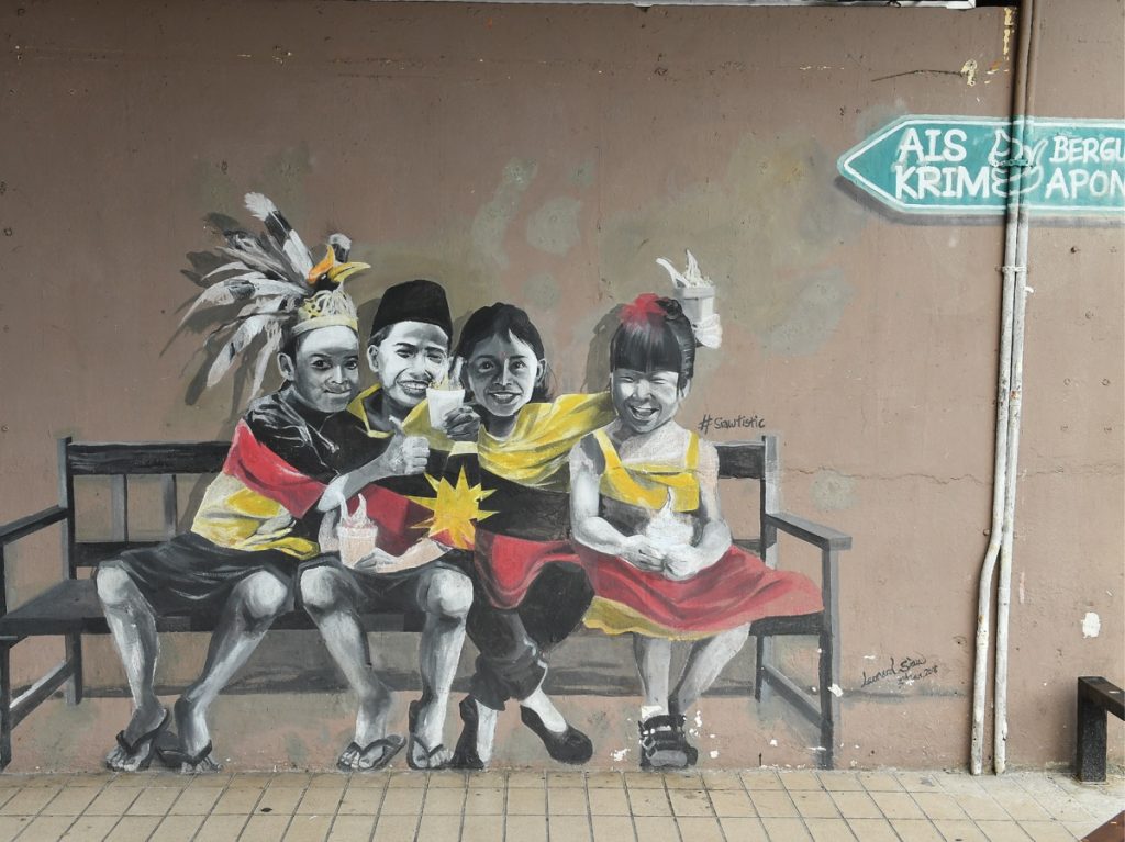 Situated near the Open Air Market in Kuching, this artwork by local artist Leonard Siaw showcases four Sarawakian children enjoying Ais Bergula Apong (a local ice cream infused with caramelised palm sugar). The children are from various ethnicities but united by their attires that represent the state’s ag. Through his brush strokes, the artist expresses the theme of unity between races. After taking photos of the cheerful children, visitors can get a taste of this special ice cream at R.G. Ais Krim Bergula Apong located inside the market.