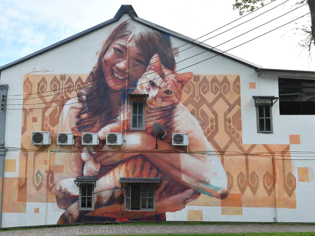 Kuching is known as the ‘Cat City’. True to its name, this mural along Jalan Wawasan showcases the furry feline. The sight of a woman lovingly holding her cat, her face lit up with happiness, is enough to melt the hearts of cat lovers from around the world. Splashed across the wall of a two-storey building, the painting is cleverly titled “I Love Kuching”. It comes under the Old Kuching Smart Heritage initiative to present the city’s history and heritage through murals.
